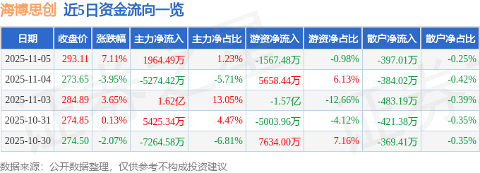 证券之星消息,截至2025年11月5日收盘,海博思创(688411)报收于293.11元,上涨7.11%,换手率14.61%,成交量5.54万手,成交额15.94亿元。