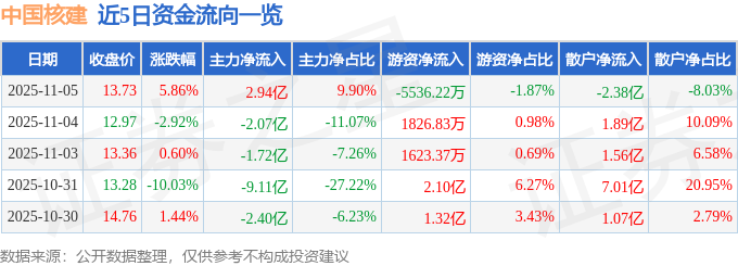 证券之星消息,截至2025年11月5日收盘,中国核建(601611)报收于13.73元,上涨5.86%,换手率7.33%,成交量220.8万手,成交额29.67亿元。
