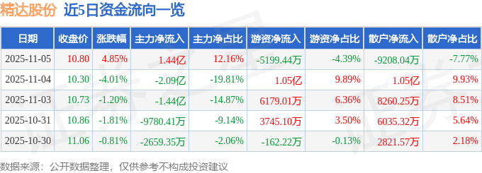证券之星消息,截至2025年11月5日收盘,精达股份(600577)报收于10.8元,上涨4.85%,换手率5.2%,成交量111.84万手,成交额11.85亿元。