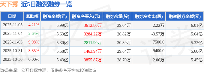 证券之星消息,截至2025年11月5日收盘,天下秀(600556)报收于6.93元,上涨4.21%,换手率13.56%,成交量245.07万手,成交额16.78亿元。