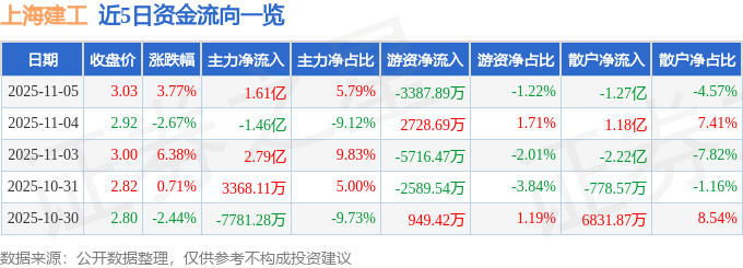证券之星消息,截至2025年11月5日收盘,上海建工(600170)报收于3.03元,上涨3.77%,换手率10.32%,成交量916.59万手,成交额27.81亿元。