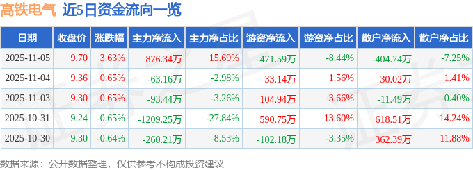 证券之星消息,截至2025年11月5日收盘,高铁电气(688285)报收于9.7元,上涨3.63%,换手率1.55%,成交量5.84万手,成交额5584.6万元。
