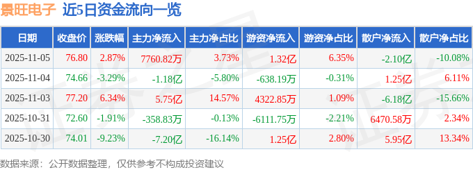证券之星消息,截至2025年11月5日收盘,景旺电子(603228)报收于76.8元,上涨2.87%,换手率2.83%,成交量27.62万手,成交额20.83亿元。