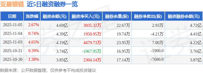 亚星锚链融资融券信息显示,融资方面,当日融资买入1.24亿元,融资偿还9376.0万元,融资净买入3035.32万元,连续3日净买入累计9465.99万元。融券方面,融券卖出5.36万股,融券偿还2.43万股,融券余量22.67万股,融券余额253.22万元。融资融券余额4.72亿元。
