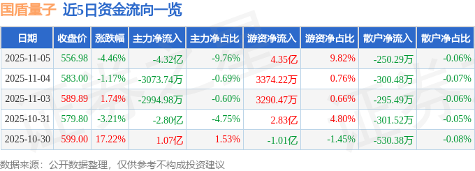 证券之星消息,截至2025年11月5日收盘,国盾量子(688027)报收于556.98元,下跌4.46%,换手率9.92%,成交量7.97万手,成交额44.27亿元。