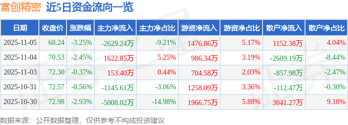 证券之星消息,截至2025年11月5日收盘,富创精密(688409)报收于68.24元,下跌3.25%,换手率1.35%,成交量4.15万手,成交额2.85亿元。