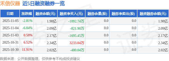 禾信仪器融资融券信息显示,融资方面,当日融资买入3427.91万元,融资偿还4520.66万元,融资净偿还1092.74万元。融券方面,融券卖出0.0股,融券偿还0.0股,融券余量0.0股,融券余额0.0万元。融资融券余额1.98亿元。