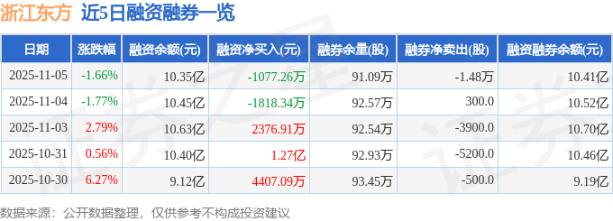 浙江东方融资融券信息显示,融资方面,当日融资买入1.36亿元,融资偿还1.47亿元,融资净偿还1077.26万元。融券方面,融券卖出500.0股,融券偿还1.53万股,融券余量91.09万股,融券余额647.65万元。融资融券余额10.41亿元。