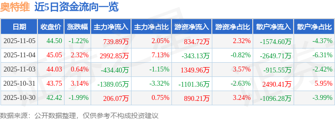 11月5日的资金流向数据方面,主力资金净流入739.89万元,占总成交额2.05%,游资资金净流入834.72万元,占总成交额2.32%,散户资金净流出1574.6万元,占总成交额4.37%。