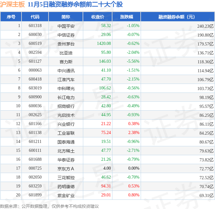 沪深主板融资融券余额前三分别为:中国平安(601318)融资融券余额240.23亿元、中信证券(600030)融资融券余额190.8亿元、贵州茅台(600519)融资融券余额179.57亿元,前20具体见下表:
