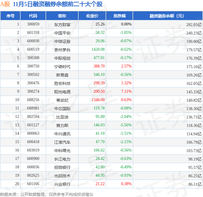 A股融资融券余额前三分别为:东方财富(300059)融资融券余额282.85亿元、中国平安(601318)融资融券余额240.23亿元、中信证券(600030)融资融券余额190.8亿元,前20具体见下表: