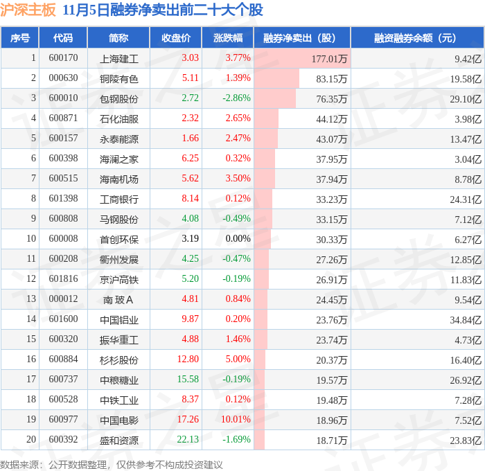 沪深主板融券净卖出前三分别为:上海建工(600170)融券净卖出177.01万股、铜陵有色(000630)融券净卖出83.15万股、包钢股份(600010)融券净卖出76.35万股,前20具体见下表: