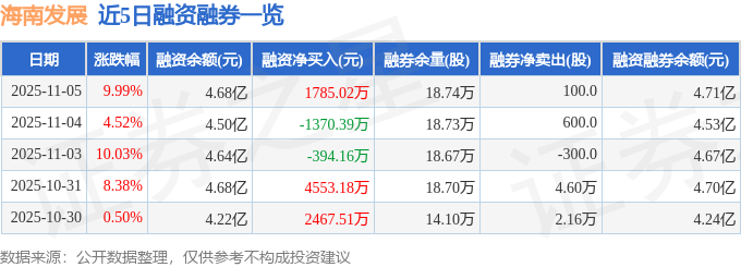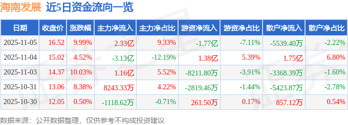 证券之星消息,截至2025年11月5日收盘,海南发展(002163)报收于16.52元,上涨9.99%,涨停,换手率19.67%,成交量158.05万手,成交额24.96亿元。