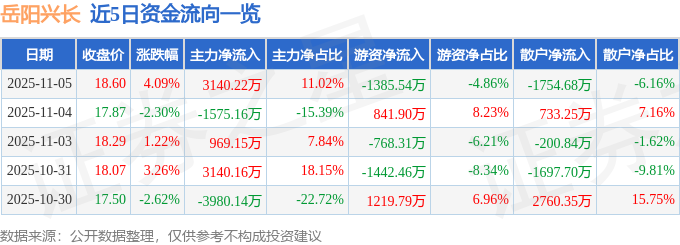 证券之星消息,截至2025年11月5日收盘,岳阳兴长(000819)报收于18.6元,上涨4.09%,换手率4.23%,成交量15.44万手,成交额2.85亿元。