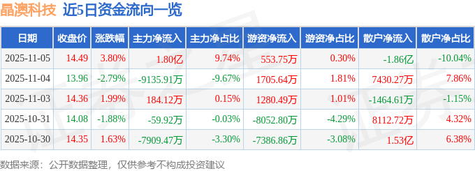 11月5日的资金流向数据方面,主力资金净流入1.8亿元,占总成交额9.74%,游资资金净流入553.75万元,占总成交额0.3%,散户资金净流出1.86亿元,占总成交额10.04%。