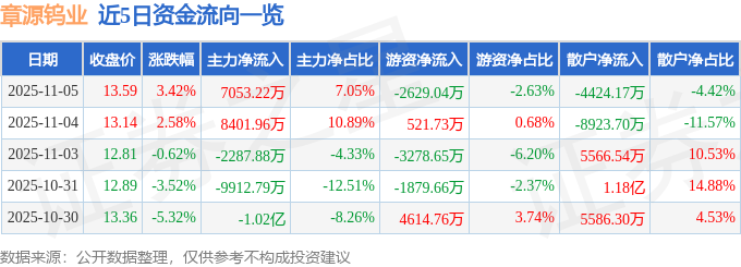 证券之星消息,截至2025年11月5日收盘,章源钨业(002378)报收于13.59元,上涨3.42%,换手率6.19%,成交量74.02万手,成交额10.0亿元。