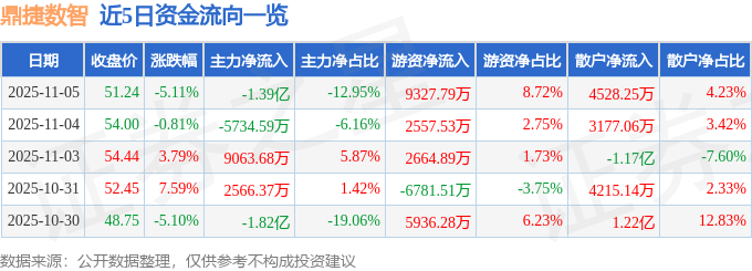 证券之星消息,截至2025年11月5日收盘,鼎捷数智(300378)报收于51.24元,下跌5.11%,换手率7.73%,成交量20.83万手,成交额10.7亿元。