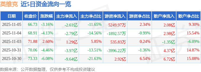证券之星消息,截至2025年11月5日收盘,英维克(002837)报收于66.73元,下跌3.16%,换手率3.97%,成交量33.75万手,成交额22.4亿元。