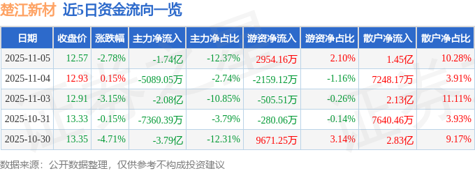 11月5日的资金流向数据方面,主力资金净流出1.74亿元,占总成交额12.37%,游资资金净流入2954.16万元,占总成交额2.1%,散户资金净流入1.45亿元,占总成交额10.28%。