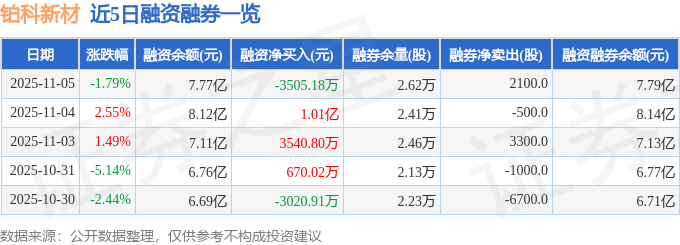 证券之星消息,截至2025年11月5日收盘,铂科新材(300811)报收于80.1元,下跌1.79%,换手率3.45%,成交量8.2万手,成交额6.48亿元。