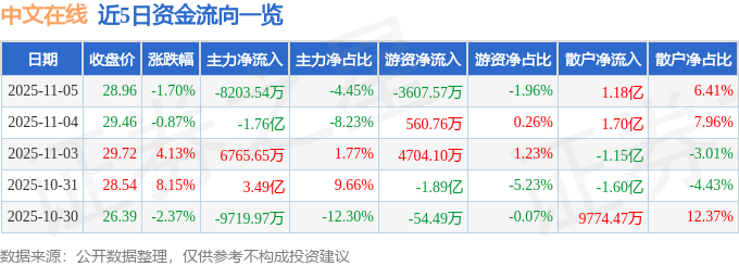 11月5日的资金流向数据方面,主力资金净流出8203.54万元,占总成交额4.45%,游资资金净流出3607.57万元,占总成交额1.96%,散户资金净流入1.18亿元,占总成交额6.41%。
