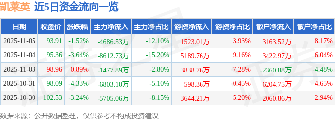11月5日的资金流向数据方面,主力资金净流出4686.53万元,占总成交额12.1%,游资资金净流入1523.01万元,占总成交额3.93%,散户资金净流入3163.52万元,占总成交额8.17%。