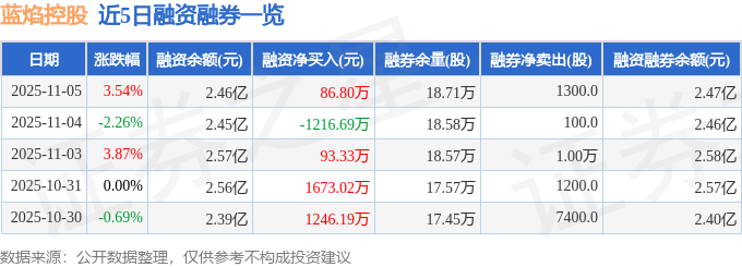 蓝焰控股融资融券信息显示,融资方面,当日融资买入2539.18万元,融资偿还2452.38万元,融资净买入86.8万元。融券方面,融券卖出1600.0股,融券偿还300.0股,融券余量18.71万股,融券余额142.38万元。融资融券余额2.47亿元。