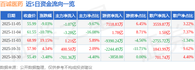 证券之星消息,截至2025年11月5日收盘,百诚医药(301096)报收于55.99元,下跌9.03%,换手率23.71%,成交量19.63万手,成交额11.04亿元。