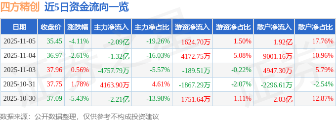 证券之星消息,截至2025年11月5日收盘,四方精创(300468)报收于35.45元,下跌4.11%,换手率5.69%,成交量30.16万手,成交额10.83亿元。