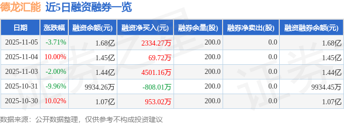 德龙汇能融资融券信息显示,融资方面,当日融资买入6794.64万元,融资偿还4460.37万元,融资净买入2334.27万元,连续3日净买入累计6905.15万元。融券方面,融券卖出0.0股,融券偿还0.0股,融券余量200.0股,融券余额0.2万元。融资融券余额1.68亿元。