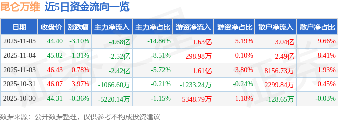 证券之星消息,截至2025年11月5日收盘,昆仑万维(300418)报收于44.4元,下跌3.1%,换手率5.68%,成交量71.3万手,成交额31.48亿元。