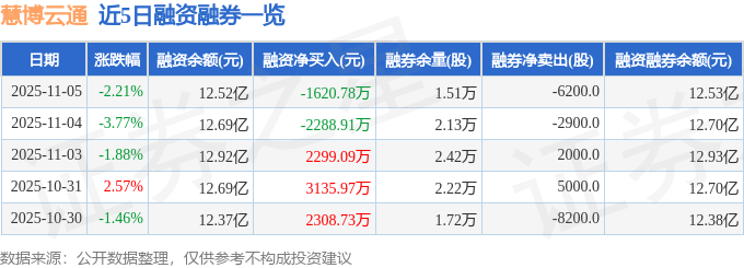 慧博云通融资融券信息显示,融资方面,当日融资买入2170.26万元,融资偿还3791.04万元,融资净偿还1620.78万元。融券方面,融券卖出0.0股,融券偿还6200.0股,融券余量1.51万股,融券余额78.01万元。融资融券余额12.53亿元。