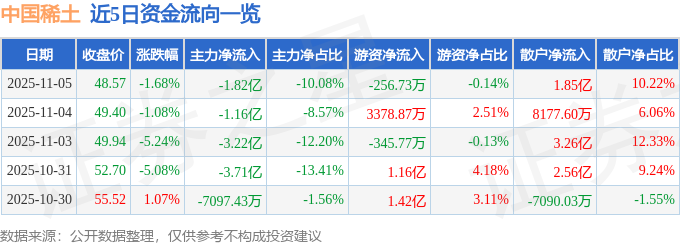 证券之星消息,截至2025年11月5日收盘,中国稀土(000831)报收于48.57元,下跌1.68%,换手率3.53%,成交量37.43万手,成交额18.08亿元。