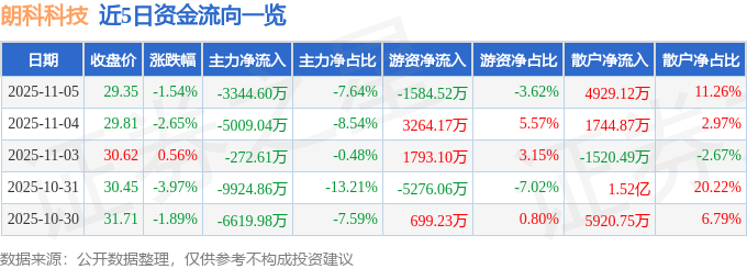 证券之星消息,截至2025年11月5日收盘,朗科科技(300042)报收于29.35元,下跌1.54%,换手率7.51%,成交量15.05万手,成交额4.38亿元。