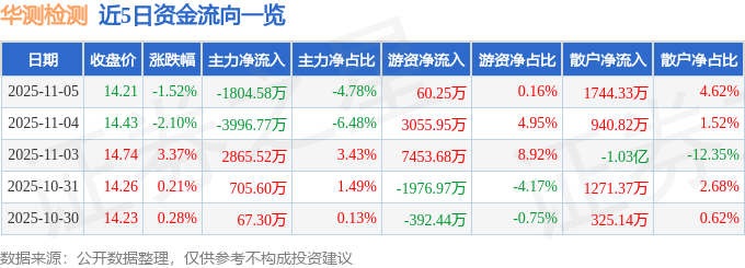 证券之星消息,截至2025年11月5日收盘,华测检测(300012)报收于14.21元,下跌1.52%,换手率1.86%,成交量26.57万手,成交额3.78亿元。