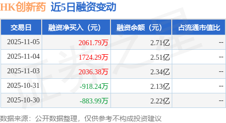 证券之星消息,11月5日,HK创新药(159567)融资买入1.39亿元,融资偿还1.18亿元,融资净买入2061.79万元,融资余额2.71亿元,近3个交易日已连续净买入累计5822.46万元。