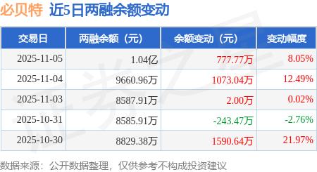 证券之星消息,11月5日,必贝特(688759)融资买入4851.12万元,融资偿还4073.35万元,融资净买入777.77万元,融资余额1.04亿元,近3个交易日已连续净买入累计1852.81万元。