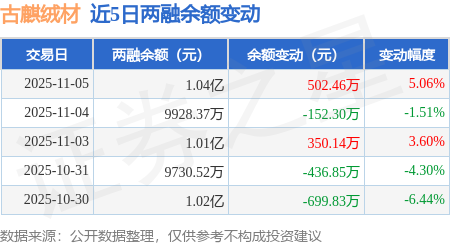 证券之星消息,11月5日,古麒绒材(001390)融资买入1682.91万元,融资偿还1180.45万元,融资净买入502.46万元,融资余额1.04亿元。