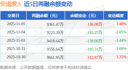 证券之星消息,11月5日,安道麦A(000553)融资买入273.13万元,融资偿还137.04万元,融资净买入136.08万元,融资余额9361.47万元。