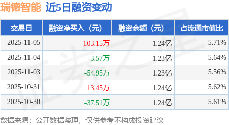 证券之星消息,11月5日,瑞德智能(301135)融资买入408.58万元,融资偿还305.43万元,融资净买入103.15万元,融资余额1.24亿元。