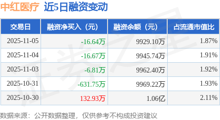 证券之星消息,11月5日,中红医疗(300981)融资买入413.35万元,融资偿还429.99万元,融资净卖出16.64万元,融资余额9929.1万元。
