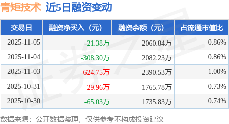证券之星消息,11月5日,青矩技术(920208)融资买入97.11万元,融资偿还118.5万元,融资净卖出21.38万元,融资余额2060.84万元。