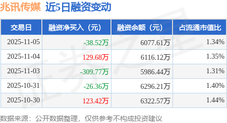 证券之星消息,11月5日,兆讯传媒(301102)融资买入485.62万元,融资偿还524.13万元,融资净卖出38.52万元,融资余额6077.61万元。