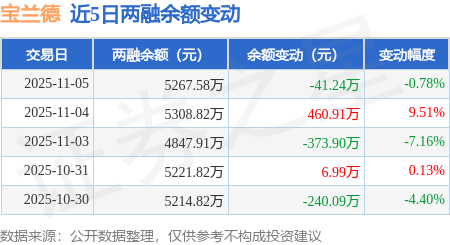 证券之星消息,11月5日,宝兰德(688058)融资买入820.73万元,融资偿还861.96万元,融资净卖出41.24万元,融资余额5267.58万元。