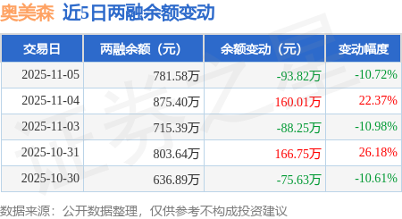 证券之星消息,11月5日,奥美森(920080)融资买入101.6万元,融资偿还195.42万元,融资净卖出93.82万元,融资余额781.58万元,近20个交易日中有11个交易日出现融资净买入。