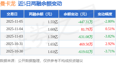 证券之星消息,11月5日,曼卡龙(300945)融资买入1340.29万元,融资偿还1787.6万元,融资净卖出447.31万元,融资余额1.55亿元。
