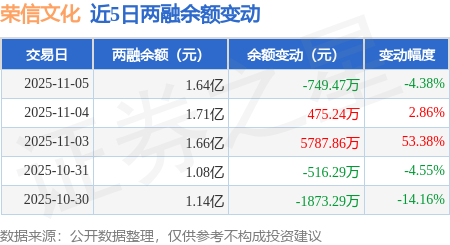 证券之星消息,11月5日,荣信文化(301231)融资买入5504.54万元,融资偿还6254.02万元,融资净卖出749.47万元,融资余额1.64亿元。
