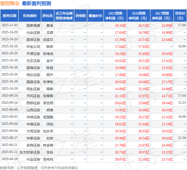 考虑到公司2025年原煤目标产量为3450万吨,当前已经完成全年目标的76%,我们预计2025年-2027年公司归母净利润为18.91/21.14/23.36亿元,对应EPS分别为1.23/1.34/1.48元/股,对应2025年11月4日收盘价的PE分别为13.07/10.50/8.07倍,维持“谨慎推荐”评级。