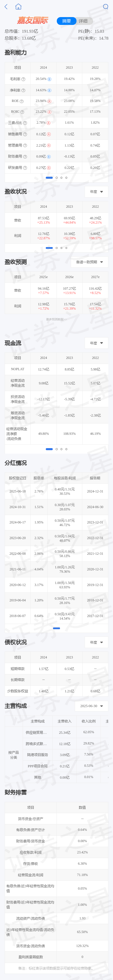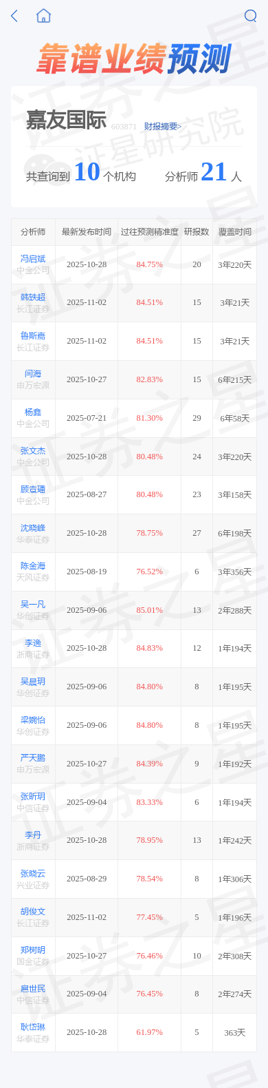 关于公司的相关逻辑和资料可以查阅分析师研报(计算过程主要参考分析师预测数据和公司历史财报数据)。此外该分析师对中国外运(601598)、东航物流(601156)、中谷物流(603565)等股票的研究也比较深入。嘉友国际的分析师靠谱业绩预测小工具截图如下: