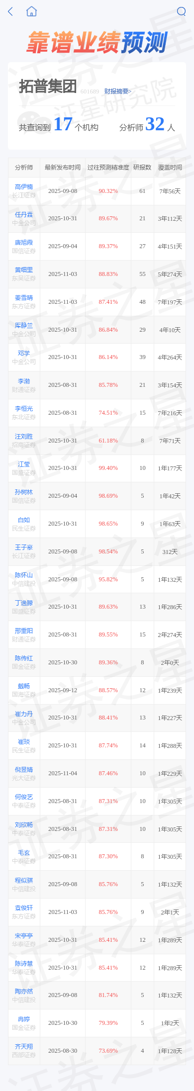 如果您对这家公司感兴趣,可以参考证星研究院统计的拓普集团的分析师业绩预测数据,其中根据长江证券的分析师高伊楠预测公司未来PE为25.0(更多特色估值数据尽在证星研究院,所有数据均来源公开资料,期且所有资料都存在一定时间滞后,所有相关数据均不可作为投资决策单一依据)。